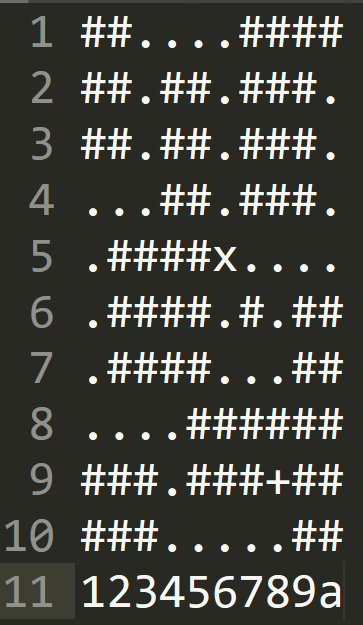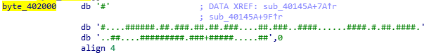 根据sub_40145A()内部结构,一开始推测是用wasd控制每次循环读取byte_402000的位置,也就是避开#、控制最后读取是+,但是发现长度不对。在师兄提点下发现是用一维数组代表二维数组,从这里看出来的: