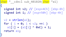 操作就是将每一位输入字符都与0xC异或后加1。那么写个脚本将v0每一位都减1后与0xC异或得到我们应该输入的值。