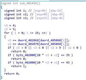 主体是一个循环体:每次v3加上数组dword_402068的第dword_405060[i]位数;v4加上数组dword_402078的第dword_405060[i]位数。然后3个if条件,如果v2\v3大于9或者小于0;byte_402000[10 * v3 + v2] == 3则返回0。只有byte_402000[10 * v3 + v2] == 43才返回1。