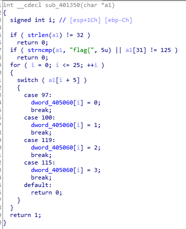 首先判断输入长度是否为32字节,然后取5~30位进入到循环结构,根据输入值的不同向dword_405060数组中写入不同的值,若无匹配则返回0。程序正常循环结束后会返回1