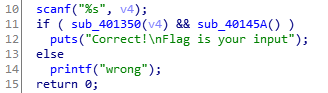 IDA打开可以看见最后一个if条件,满足则输出Correct!\nFlag is your input,提示我们输入的让条件符合的值就是flag。条件成立的前提是sub_401350(v4) && sub_40145A()两个函数的返回值相同。sub_401350的参数v4就是输入值。
