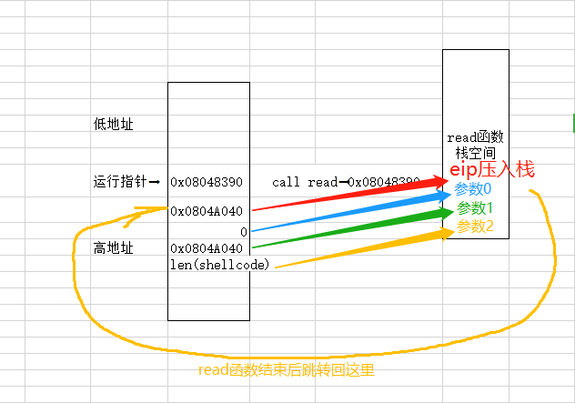 然后问题就是怎么给溢出后调用的read传参。read函数有三个参数,32位传参看图: