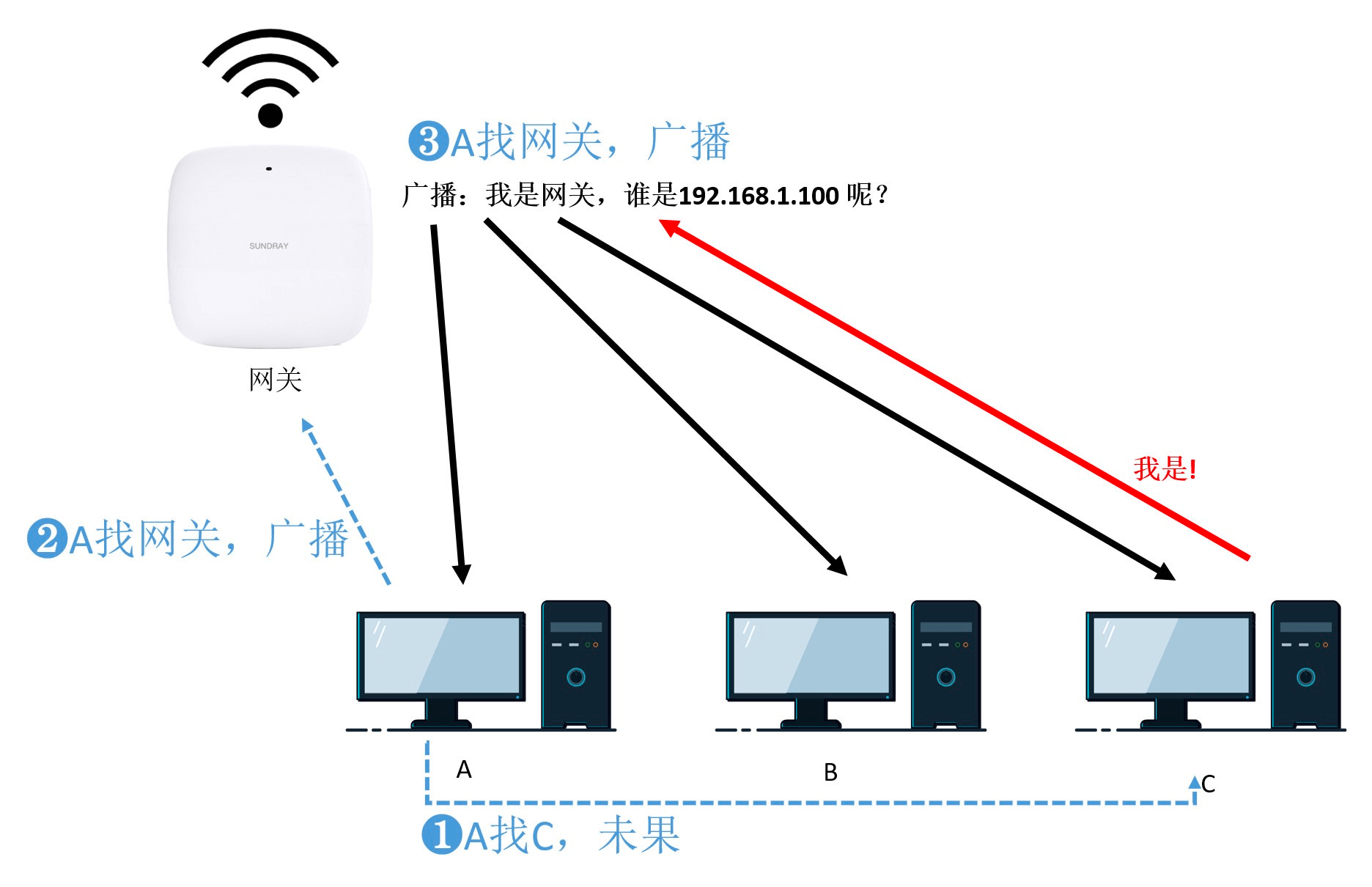 正常 APR 运作逻辑是:假设 A 与 C 在同一局域网,A 要和 C 实现通信,A 会查询本地的 ARP 缓存表,找到 C 的 IP 地址对应的 MAC 地址后,就会进行数据传输。如果未找到,A会找广播地址(网关)广播一个 ARP 请求报文,所有主机都收到 ARP 请求,只有 C 主机会回复一个数据包给 A ,同时 A 主机会将返回的这个地址保存在 ARP 缓存表中。