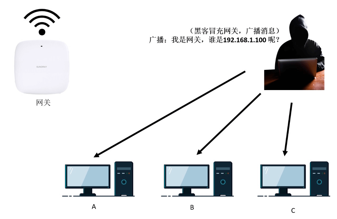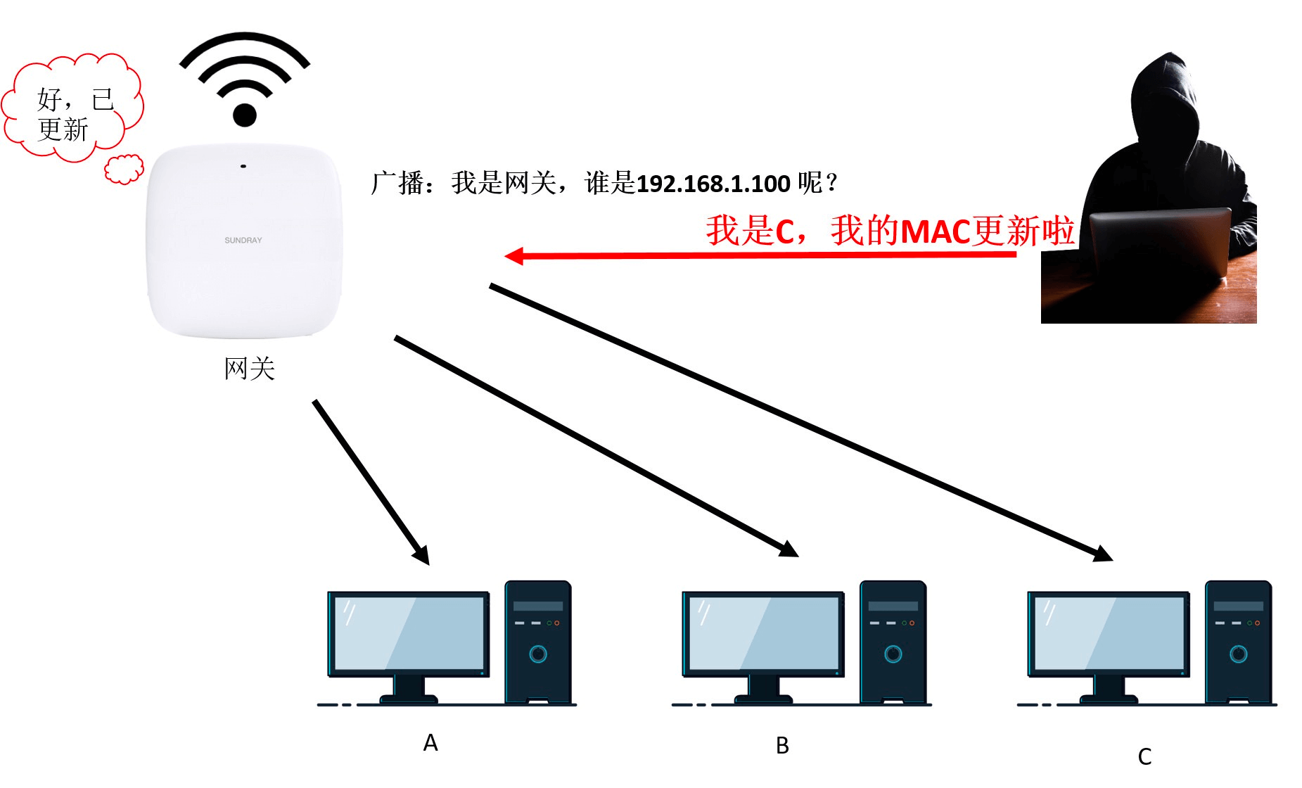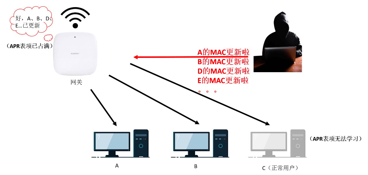 虚假的ARP报文欺骗网关相同网段内的某一合法用户的MAC地址已经更新。网关发给该用户的所有数据全部重定向到一个错误的MAC地址,导致该用户无法正常访问外网。