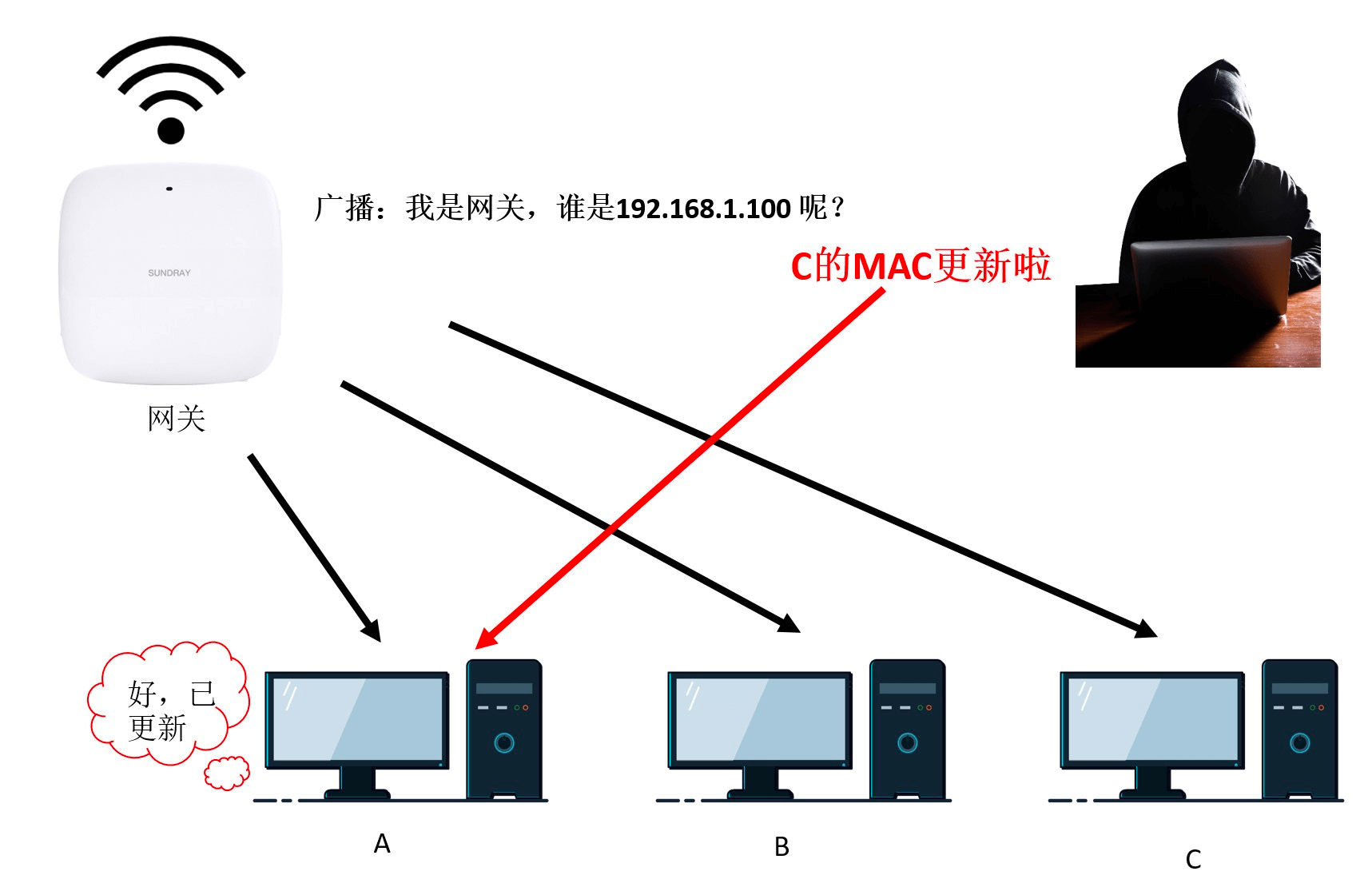 虚假的 ARP 报文欺骗相同网段内的其他主机该网段内某一合法用户的 MAC 地址已经更新。导致该网段内其他主机发给该用户的所有数据全部重定向到一个错误的 MAC 地址,导致同网段内的两台主机无法正常通信。